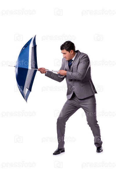 Бизнесмен с зонтиком, изолированный на белом фоне
