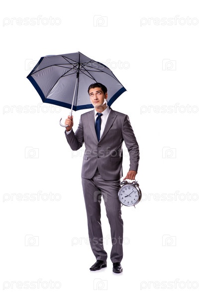 Бизнесмен с зонтиком, изолированный на белом фоне