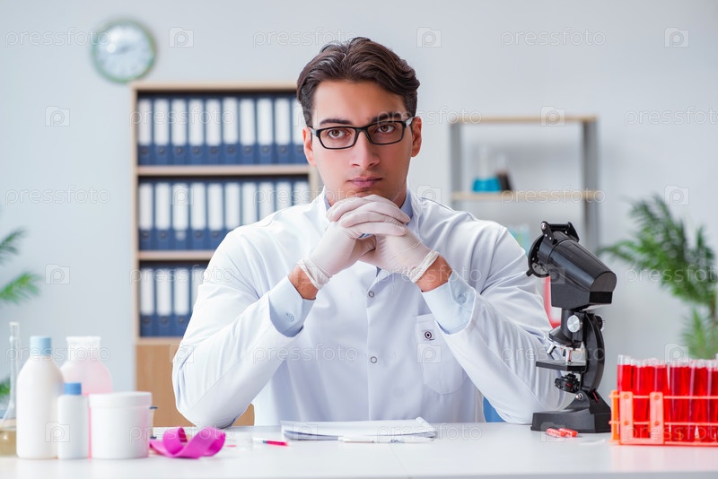 Молодой врач работает в лаборатории с микроскопом
