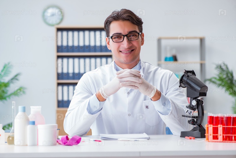 Молодой врач работает в лаборатории с микроскопом