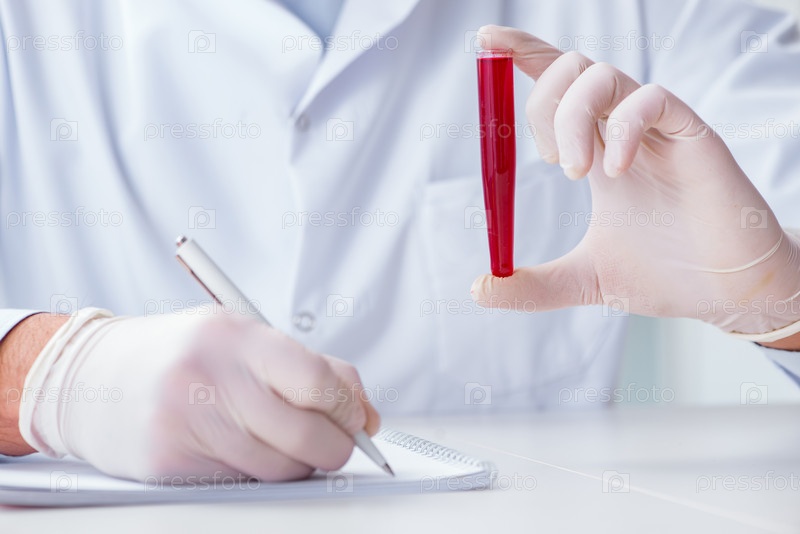 Молодой врач в лаборатории с красной трубкой