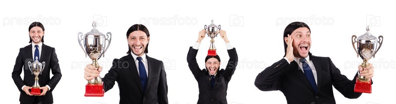 Бизнесмен награжден призовым кубком изолированный на белом