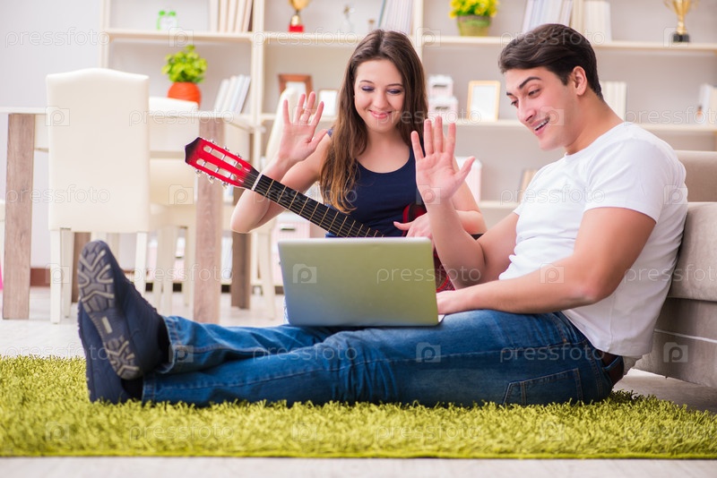 Романтическая пара играет на гитаре на полу