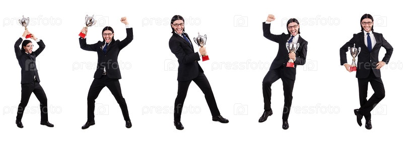 Бизнесмен награжден призовым кубком изолированный на белом