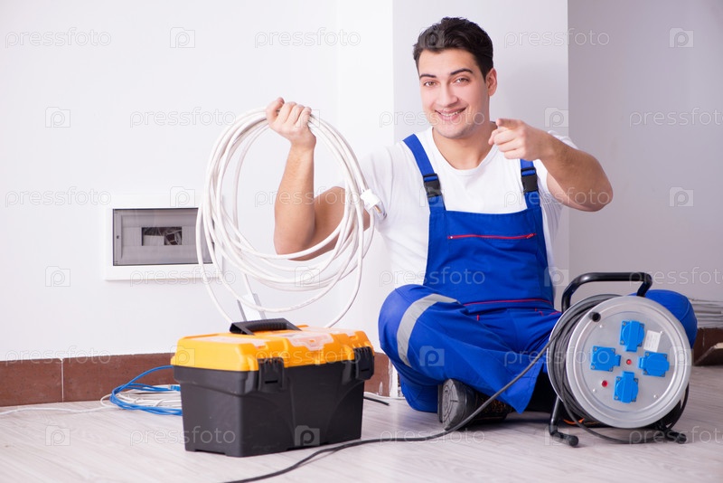 Молодой электрик работает на розетке дома