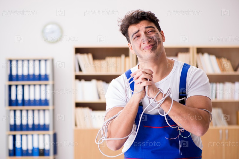 Забавный молодой электрик, запутавшийся в кабелях
