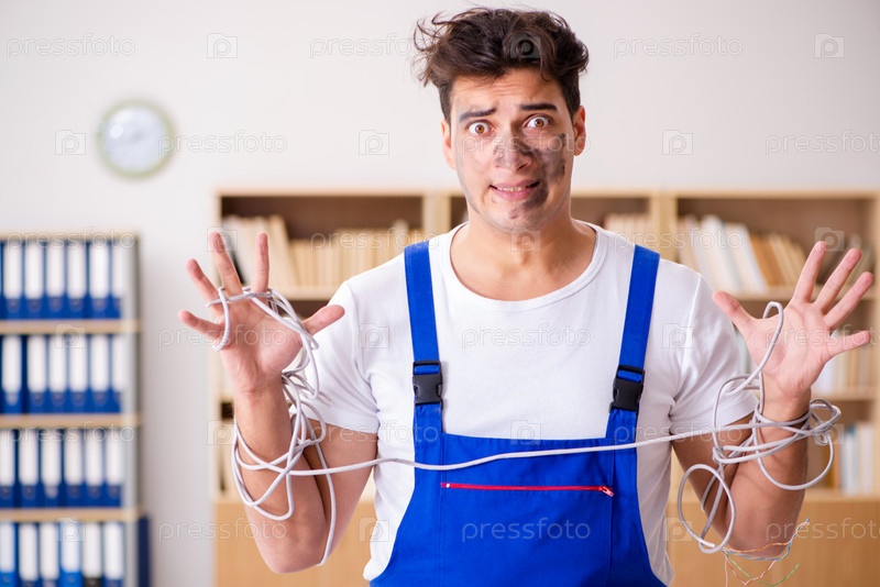 Забавный мужчина делает ремонт электрического оборудования дома