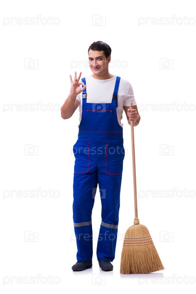 Мужчина чистит пол, изолированный на белом
