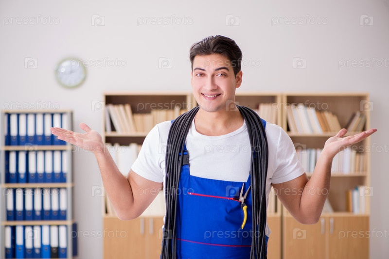Молодой электрик с кабелем работает в офисе