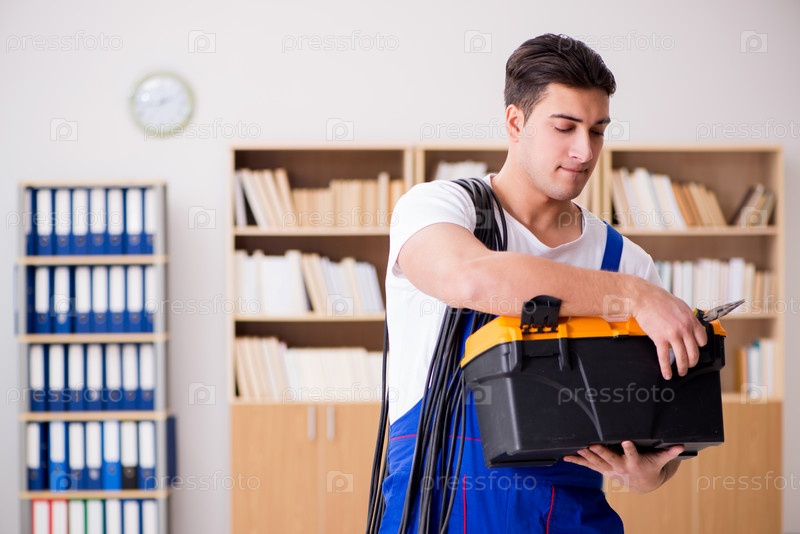 Молодой электрик с кабелем работает в офисе