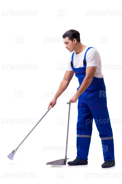 Чистильщик на стройплощадке изолированный на белом