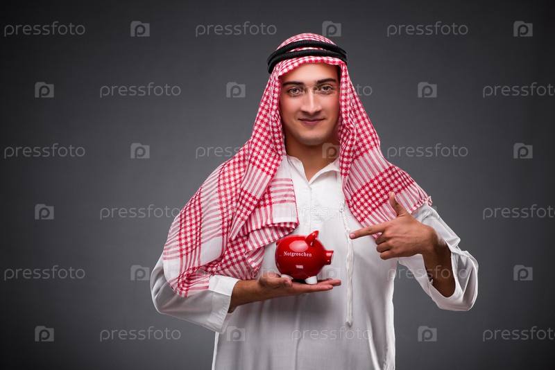 Арабский бизнесмен с пиггибанком на сером фоне