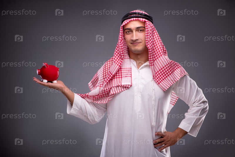 Арабский бизнесмен с пиггибанком на сером фоне
