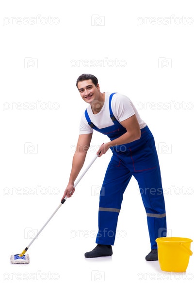 Мужчина чистит пол, изолированный на белом
