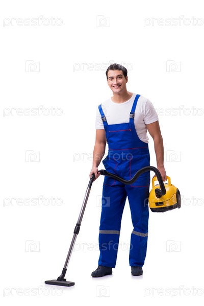 Мужчина в комбинезонах занимается пылесосом на белом