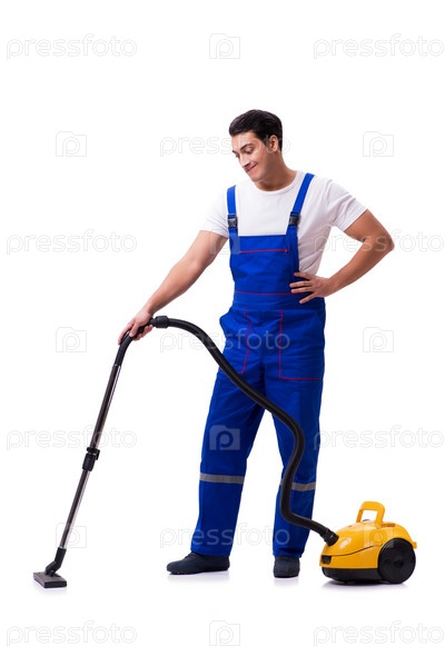 Мужчина в комбинезонах занимается пылесосом на белом