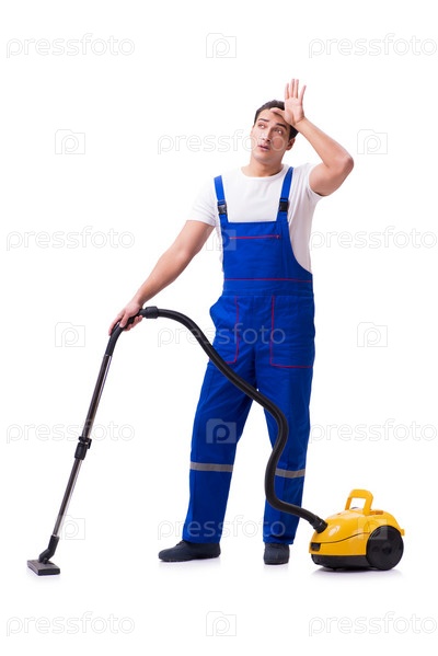 Мужчина в комбинезонах занимается пылесосом на белом