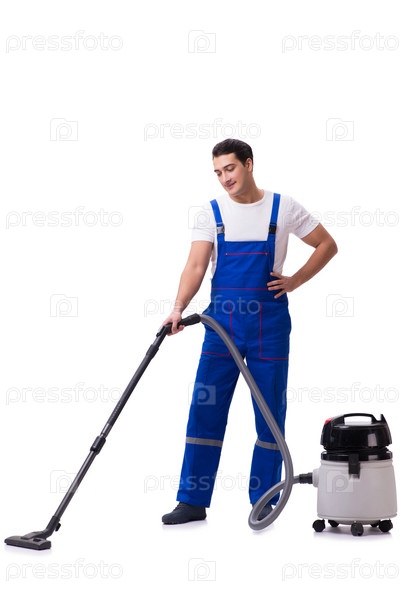 Мужчина в комбинезонах занимается пылесосом на белом