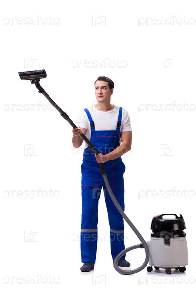 Мужчина в комбинезонах занимается пылесосом на белом