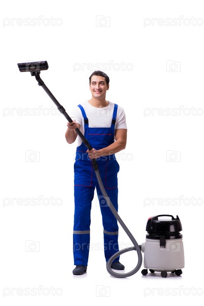 Мужчина в комбинезонах занимается пылесосом на белом