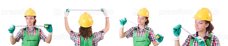 Работница в зеленых комбинезонах изолирована на белом