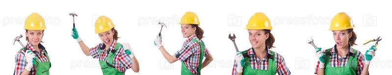 Работница в зеленых комбинезонах изолирована на белом