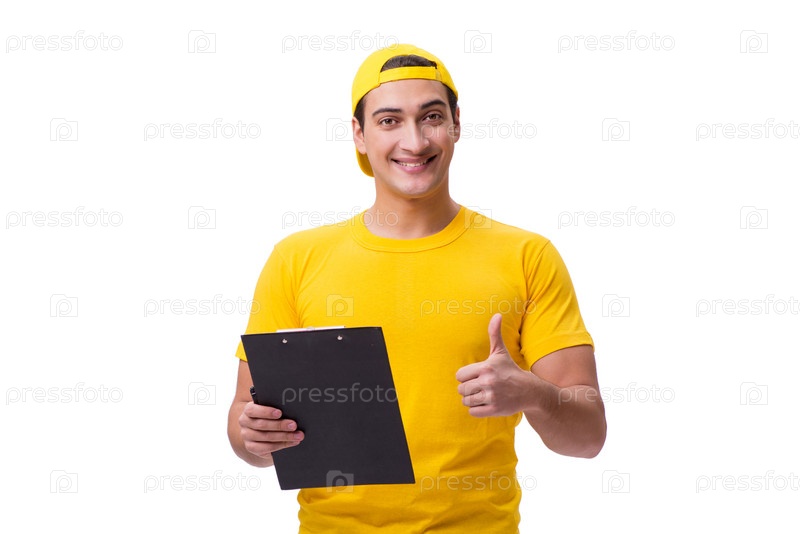 Парень-доставщик изолирован на белом фоне