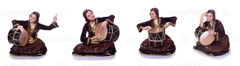 Молодая азербайджанская женщина играет на традиционных барабанах nagara