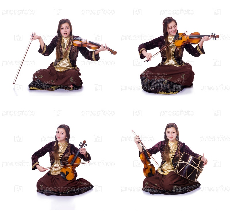 Женщина играет на скрипке на белом