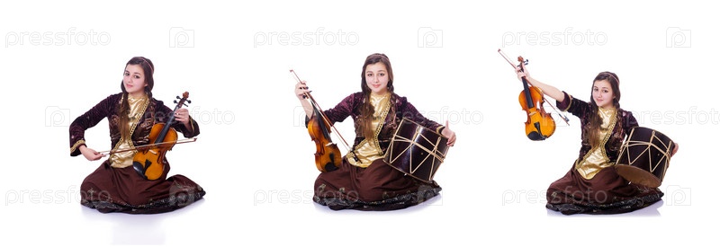 Женщина играет на скрипке на белом