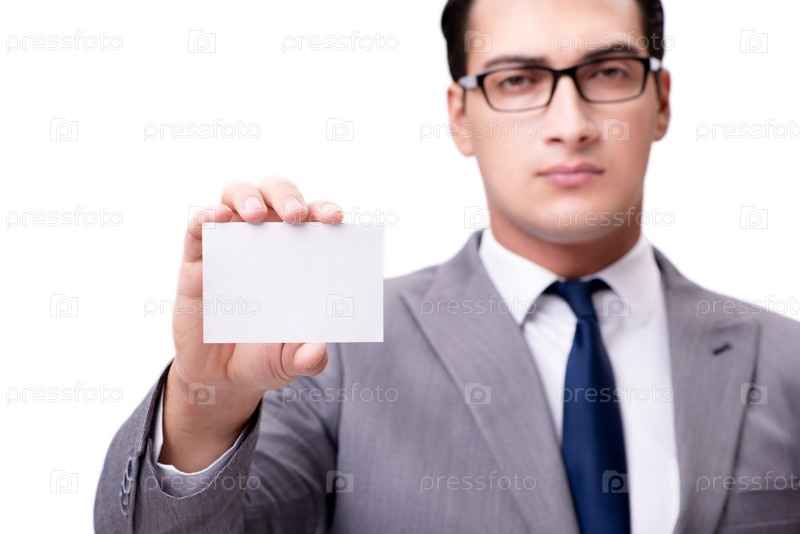 Бизнесмен с пустой карточкой изолирован на белом фоне