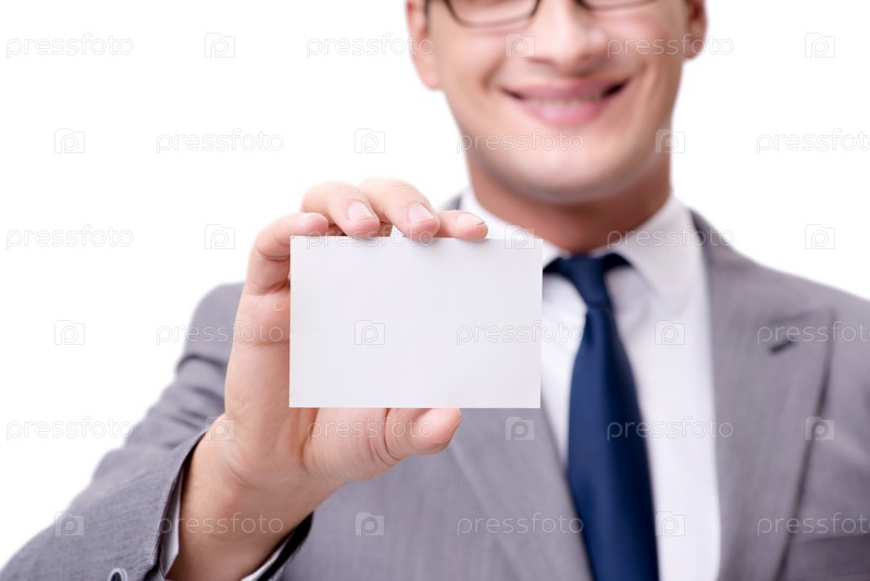Бизнесмен с пустой карточкой изолирован на белом фоне