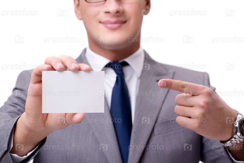 Бизнесмен с пустой карточкой изолирован на белом фоне
