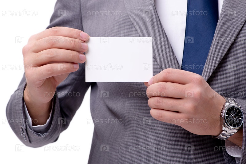 Бизнесмен с пустой карточкой изолирован на белом фоне