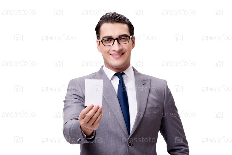 Бизнесмен с пустой карточкой изолирован на белом фоне
