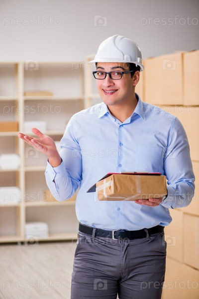 Молодой работник в почтовом отделении, занимающийся посылками