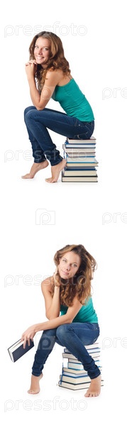 Студент, сидящий на стопе книг