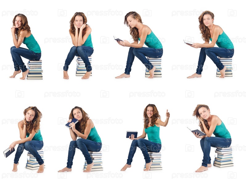 Студент, сидящий на стопе книг
