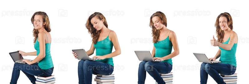 Студент с нетбуком, сидящий на книгах