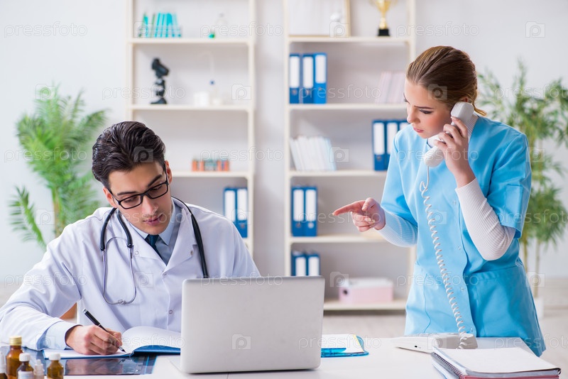 Врач и женщина обсуждают в больнице мужчину и женщину