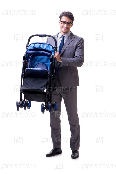Молодой отец бизнесмен с детской колясочкой, изолированной на белом