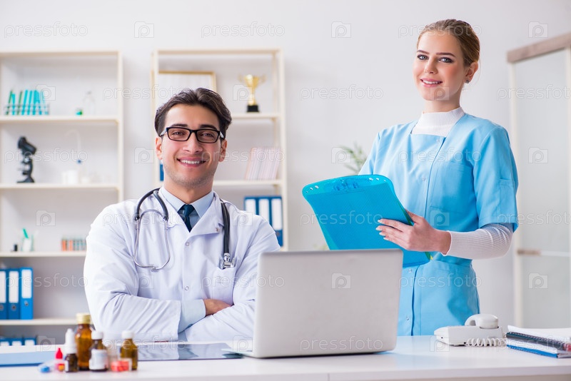 Врач и женщина обсуждают в больнице мужчину и женщину