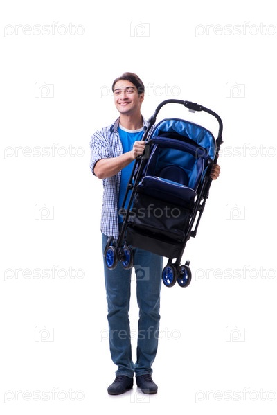 Молодой отец с детской колясочкой, изолированной на белом