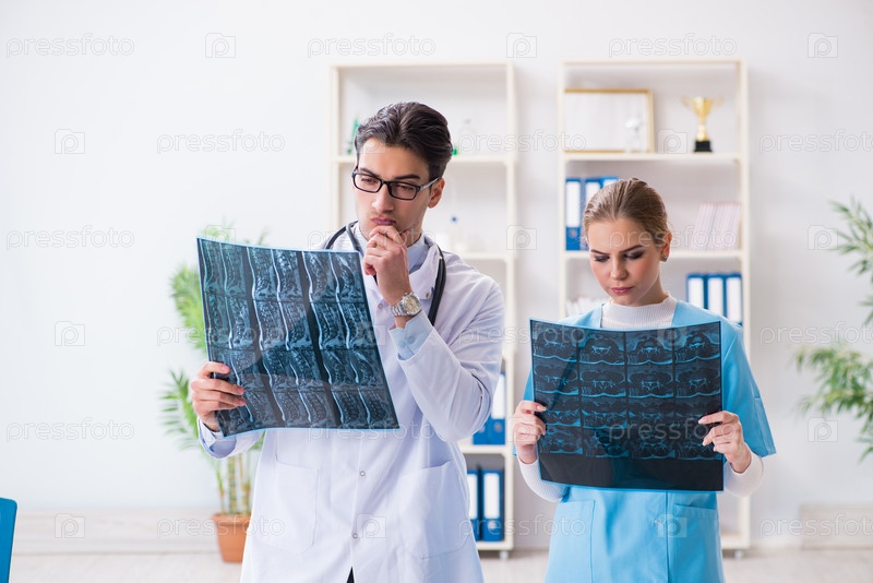 Два врача изучают рентгеновские снимки пациента для постановки диагноза