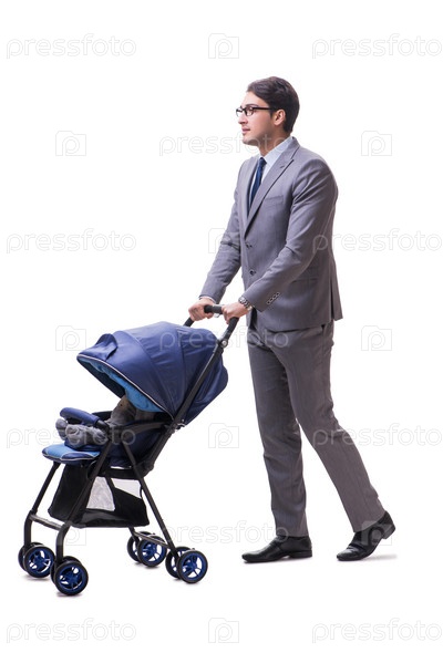 Молодой бизнесмен кормит ребенка грудью в детской коляске изолированный на белом