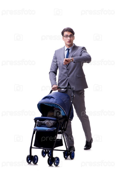 Молодой отец бизнесмен с детской колясочкой, изолированной на белом