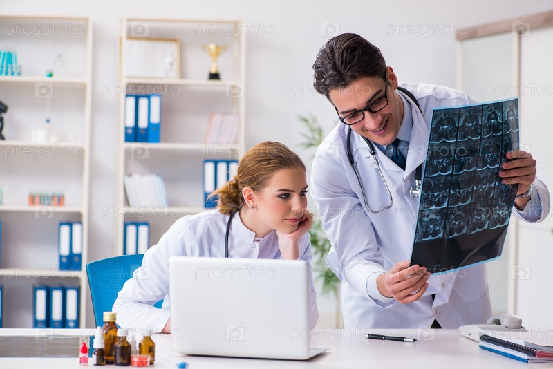 Два врача изучают рентгеновские снимки пациента для постановки диагноза