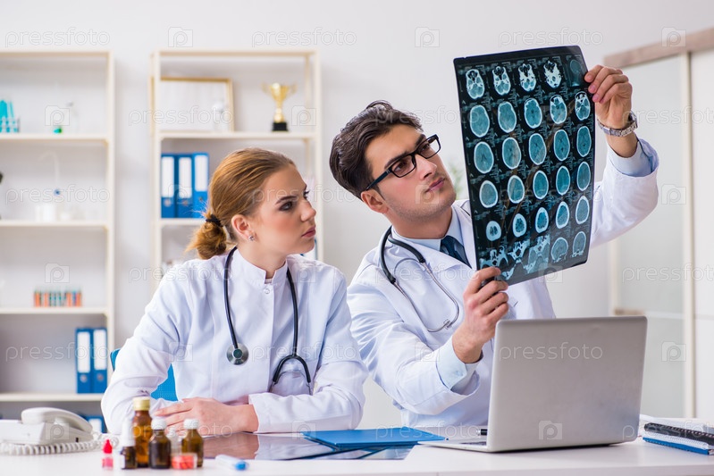 Два врача изучают рентгеновские снимки пациента для постановки диагноза