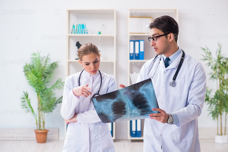 Два врача изучают рентгеновские снимки пациента для постановки диагноза