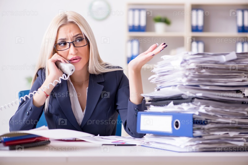 Загруженная деловая женщина, работающая в офисе за столом